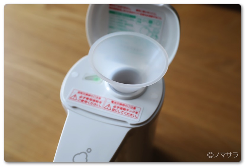 洗剤はロートを投入口に挿して本体に入れていきます。本体横に分量が見えるメモリが付いてますのでここを見ながら入れれば入れ過ぎるこはありません。