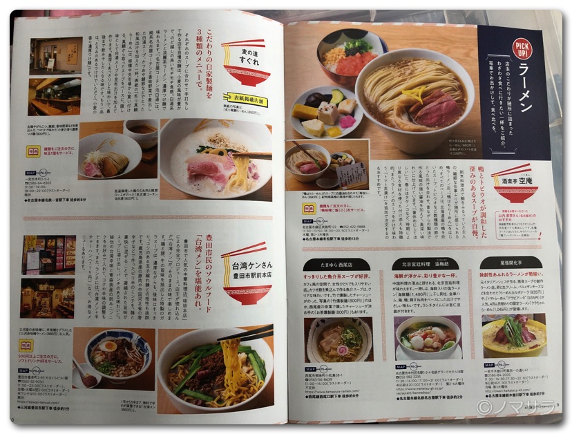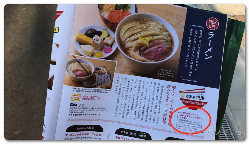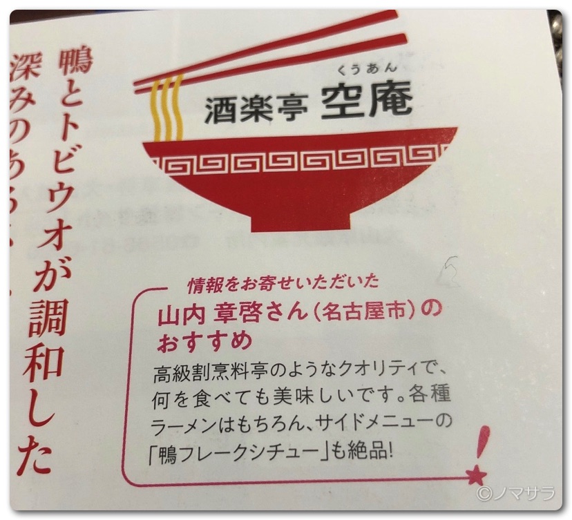 雑誌中程に「PICK UP!ラーメン」特集として名鉄沿線にあるラーメン店が6店舗取り上げられており、空庵は見出しの一番いい位置に掲載されています。写真のらーめんは大将が気合を入れすぎて麺を盛りすぎたらしく(笑)通常はここまで麺の量は多くなくてスープといいバランスになっていますのでご安心ください。