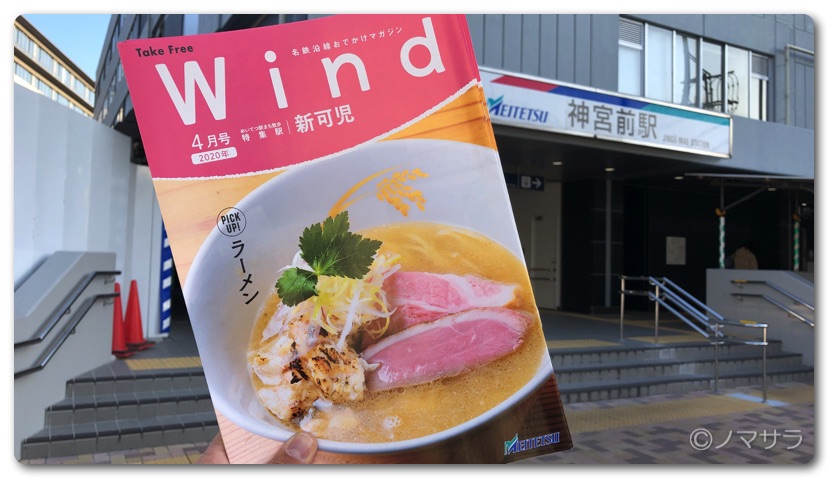 先日、とあることがきっかけで名鉄沿線おでかけマガジンWindのラーメン特集にワタクシのコメントが掲載されました。4月号が発行されたので雑誌を貰いに最寄り駅の神宮前へ。駅員の方に聞いたところ有人案内所(きっぷや定期をを買う窓口)のすぐ近くにあるマガジンラックに平積みされていました。