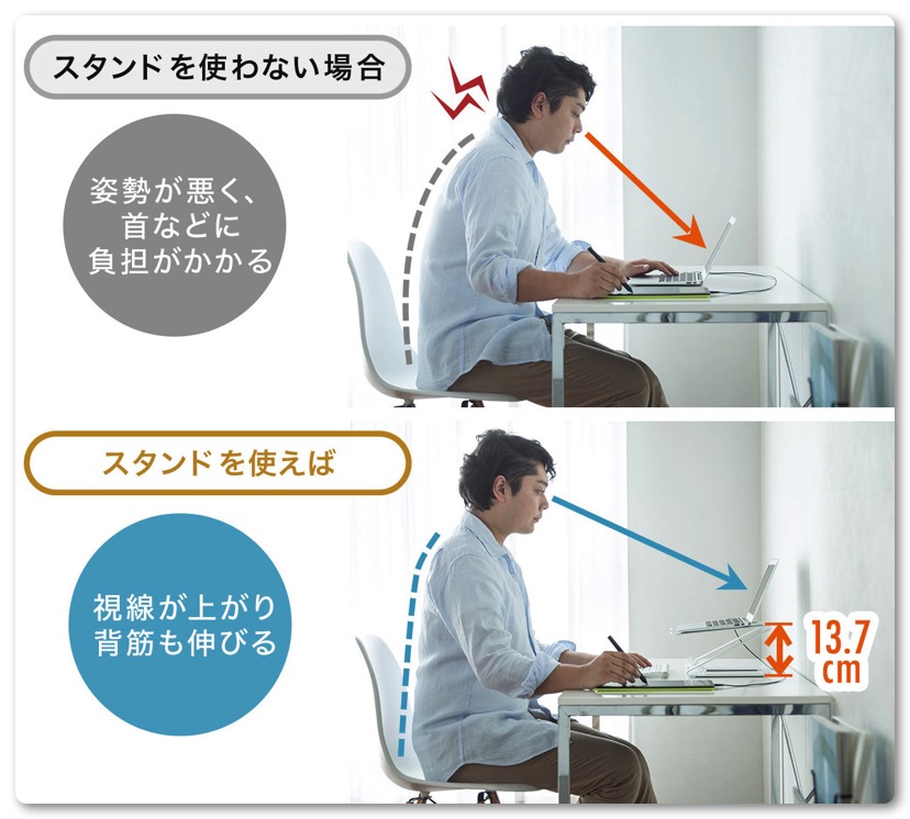 まず一つ目のノートパソコンについてはキーボードと画面がくっついているためどうしても背中が丸くなり首が下に向きます。この状態で作業すると頸椎ほか背骨にも相当な負担がかかります。デスクトップパソコンなら改善されますが、会社支給のパソコンは99%がノートパソコンなので自分で対策をするしかありません。