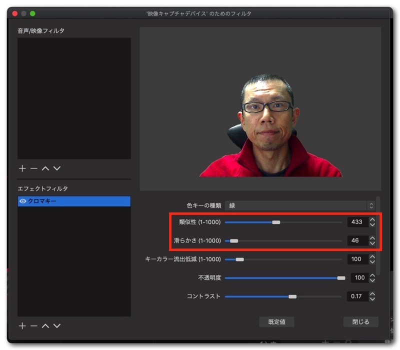 類似性のスライダーをグリーンバックが消えるところまで動かします。