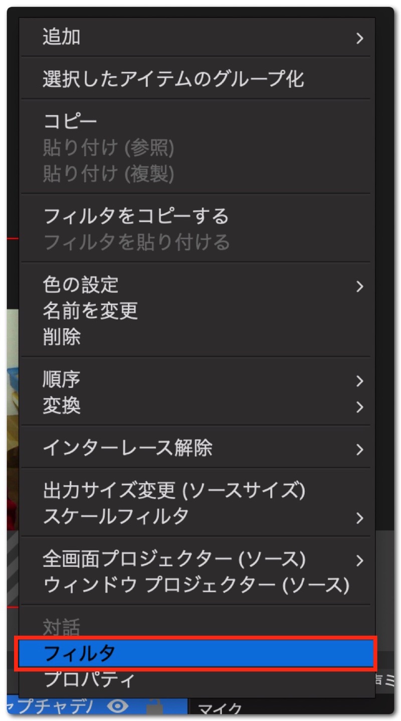 右クリックでダイアログボックスを開き「フィルタ」をクリック