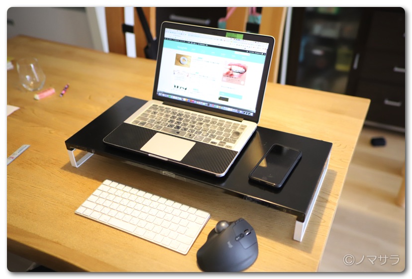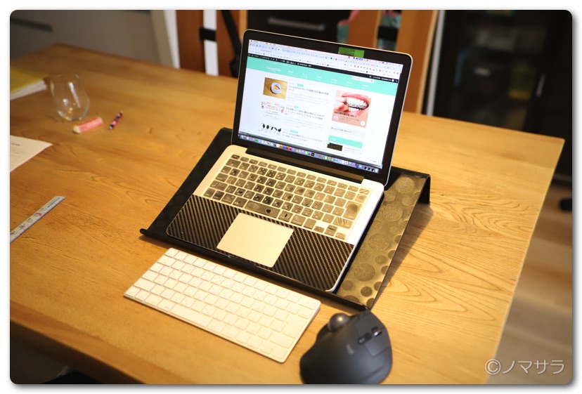 作業をする際はパソコンの位置を目線ができるだけ下がらない位置に設置しましょう。リヒトラブの机上台やIKEAのパソコン用の台と外付けキーボードがオススメ。