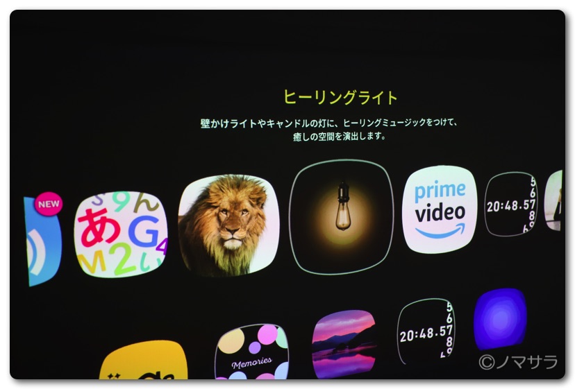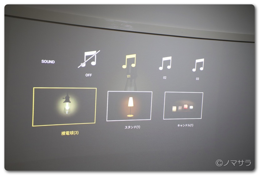その他、ヒーリングライトというコンテンツがあり、色んな形のライトと3種類のヒーリングミュージックを選択することができます。