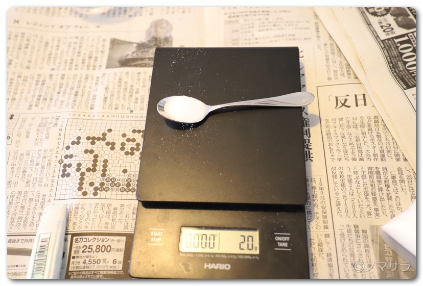 ホウ砂2gをお湯に溶かします。スケールで計ってもいいですが、小さなスプーンに軽く一杯でだいたい2gなのでなくても大丈夫。多少量が違っていても問題ありません。硬さが少し変わる程度。