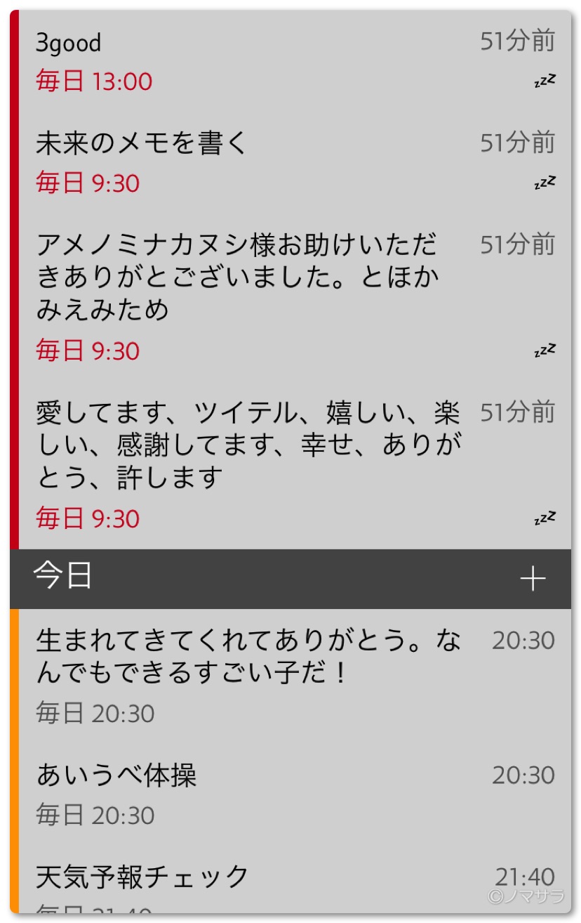 私は20項目以上入れていて、毎日同じ時間に決めたことをほぼ確実に実行できるようになりました。少しだけお見せすると「3goods」の他、「未来のメモを書く」「アメノミナカヌシ様お助けいただきありがとうございました!」「愛してます、ツイてる、嬉しい、楽しい、感謝します、幸せ、ありがとう、許します」という3つについては通知されて実行したら1時間スヌーズして一日何度も実行しています。