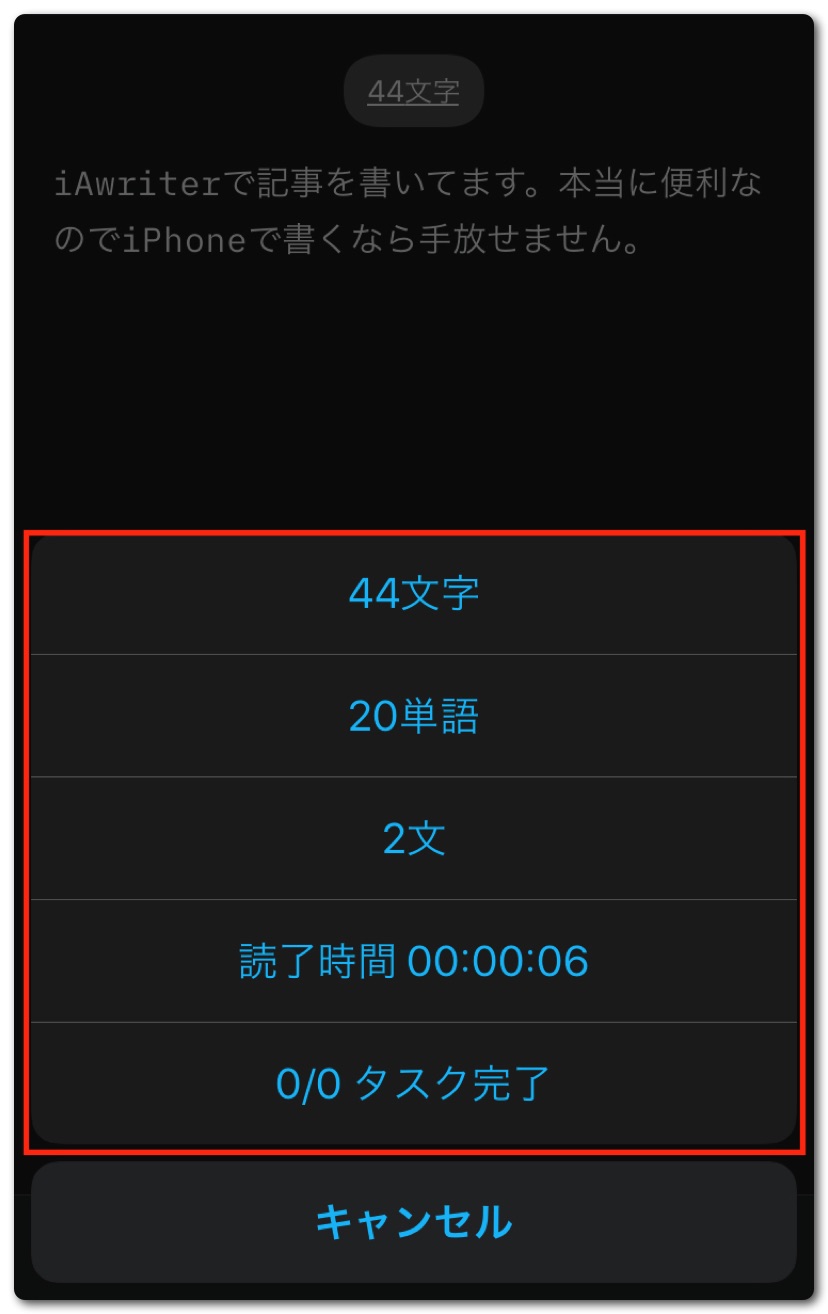 画面上部には文字数などのカウンターがありどのぐらい書いたのかを常に把握できます。文字数、単語数、文数などを選択できます。普段は文字数でカウントをしていますが常に文字数がわかるのはめちゃ便利。