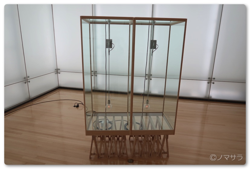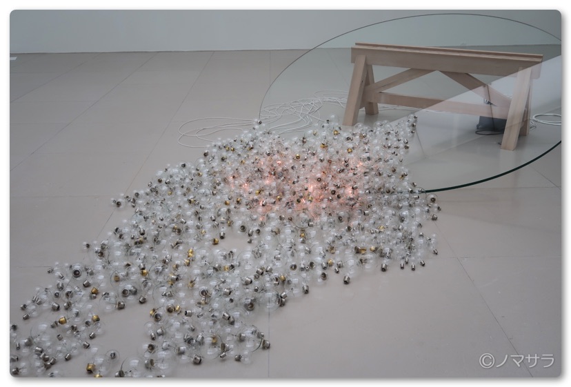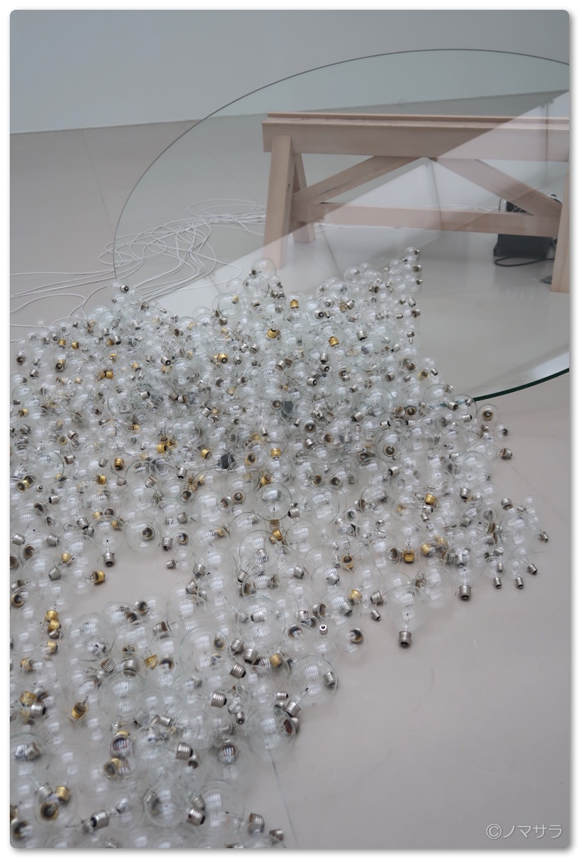 ある程度時間が経つと紙片が壁面のアルミニウム板に影を映しながらひらひらと舞い落ちます。その光景は美しい自然現象を捉えた時に感じる感覚とともに思わず目が釘付けになりました。一方、円形のガラステーブル状の彫刻は長兄2.3mの巨大なガラスの天板が傾いた状態になっており、ガラスいたと床が接する部分やその周辺に裸電球の束があり、小さな光が呼吸するようにゆっくりと明滅してます。このオブジェには円形ガラスの幾何学的な美しさ、電球の集合体の中で瞬く光の崇高さと安定していた世界が崩れるという危うさとが同居しています。