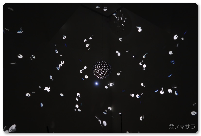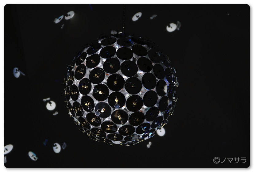 その次の「after that.」ては闇に包まれた小さなスペースにキラキラと光るミラーボールが天井から吊るされています。この球体の表面を覆うのは鏡でできた無数の丸い時計でその秒針にもすべて鏡が装着されています。時計自体も動いておりミラーボールの回転と時計の動きにより不思議な空間が形成されています。偶然かもしれませんがこのミラーボールの形がコロナウイルスにそっくりで不気味な感じがしました。