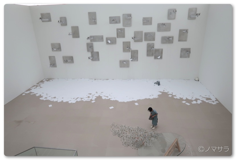 そして床からの風景と階段を登って上から眺める風景ではまた違った趣があり異なった視点で楽しむことができます。上から落ちた紙は会期中そのままにしてあるためどんどん積み重なっていきます。なお白い用紙は閉館後にスタッフが補充しているとのこと。