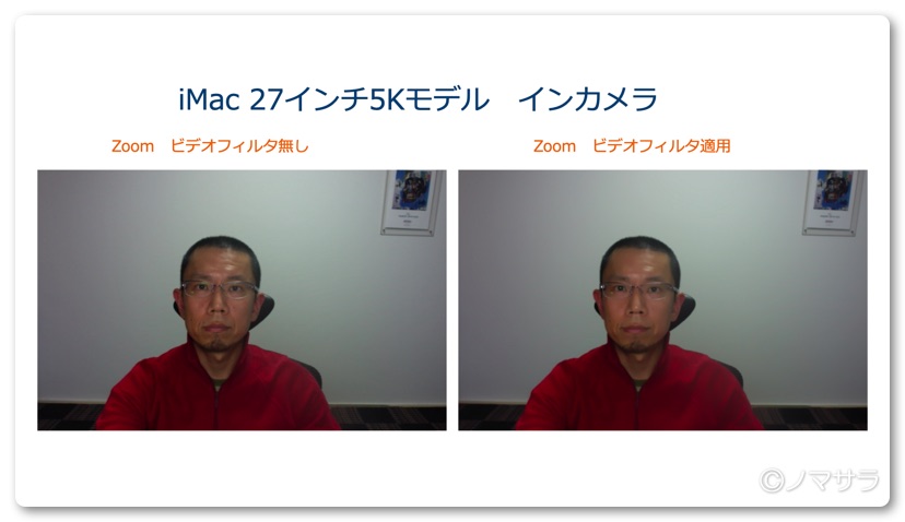 今回はiMacのインカメラ、外付けのロジクールのWebカメラ、一眼レフデジタルカメラで比較してみました。さらにそれぞれZoomのビデオフィルタを適用する、しないでの比較も行いました。
