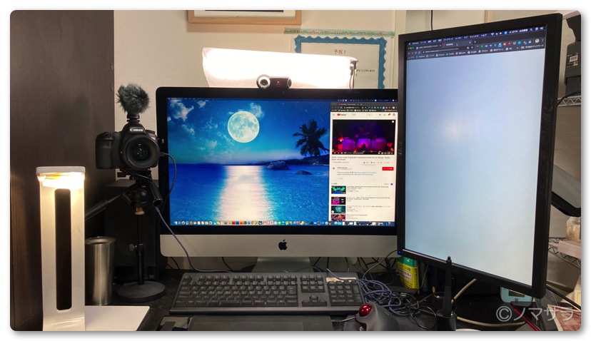 ちなみにライティングはすべて同じ条件で行いました。画面上部中央には明るさを調整できるLEDライト、左手にはLEDのスタンドライト、右側はサブディスプレイを白い画面にしてレフ板代わりに使っています。これだけライティングをしっかり行ったとしてもカメラがショボいと綺麗に映りません。ましてや天井の蛍光灯だけでは全く話になりません。