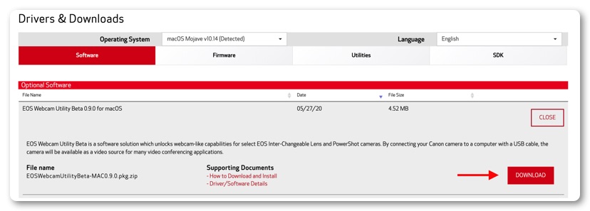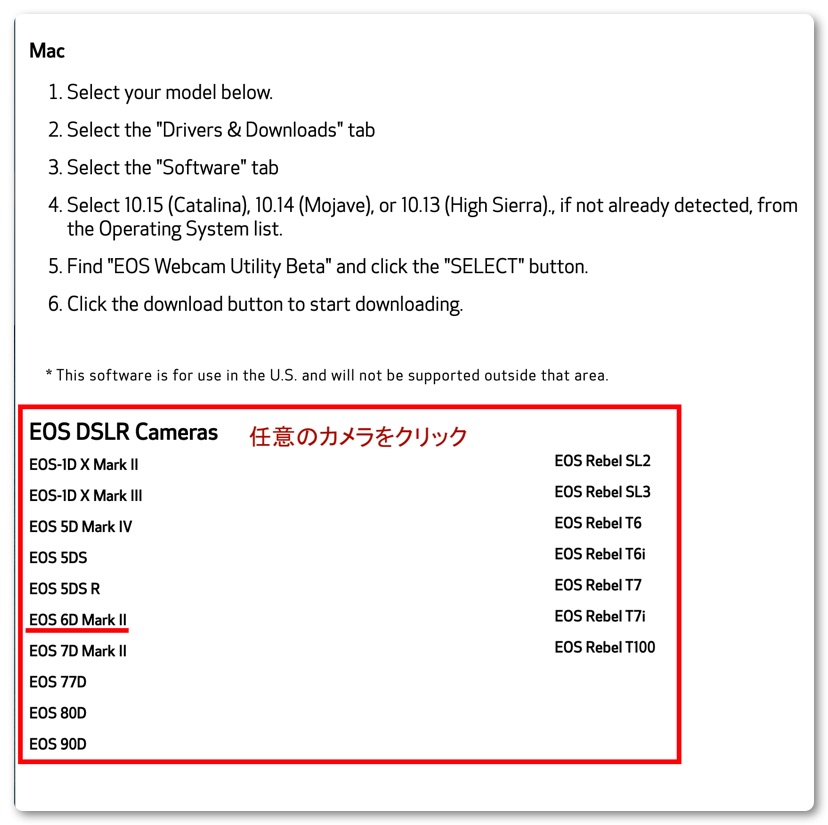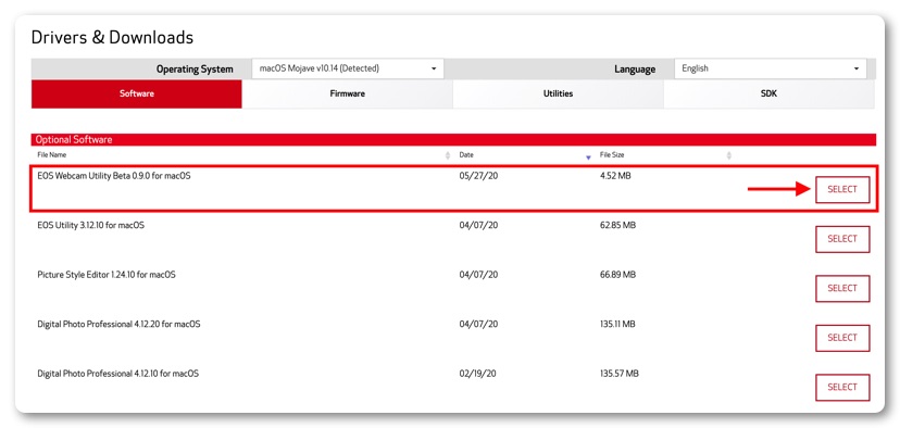 自分自身が使用しているmacOSバージョンが「Operating System」の横に表示されていることを確認した上で、「EOS Webcam Utility Beta 0.9.0 for macOS」を選択し、「SELECT」をクリック。