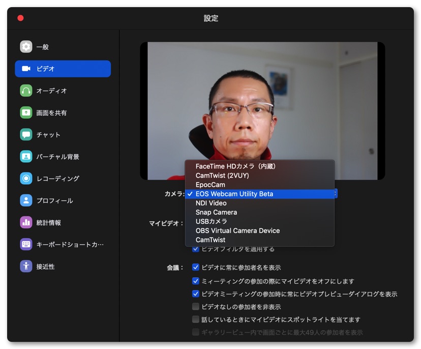 今までCameraLiveとCamTwistという2つのアプリを同時に使うことでEOS6DをWebカメラとして使っていましたが「EOS Webcam Utility」のMac版の登場によりこれらのアプリは使う必要がなくなりました。Zoomのカメラ一覧から選ぶだけになったのでかなり便利になり、大満足。キレッキレの高解像度でZoomを使うことができます。