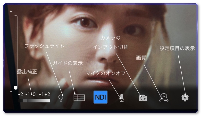 NDI HX Cameraの画面の歯車のアイコンをタップすると設定項目が出てきます。必要な機能はほぼ揃っており簡単に調整することができます。露出補正はかなり便利で+1ぐらい明るめにしておくと見た目がよくなります。