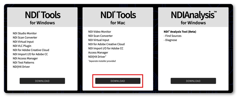 ダウンロードサイトには「NDI Tools for Mac」と「HX driver for Mac」の2つがありどちらもダウンロードします。