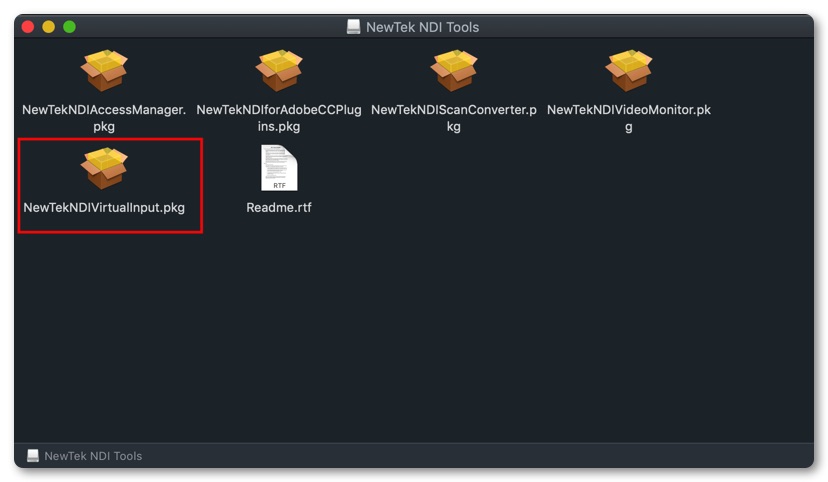 「NDI Tools for Mac」をダウンロードすると複数のpkgファイルがダウンロードされますが、「NewTekNDIVirtualInput.pkg」のみインストールします。必要なものがあれば他のpkgファイルもインストールしても構いません。
