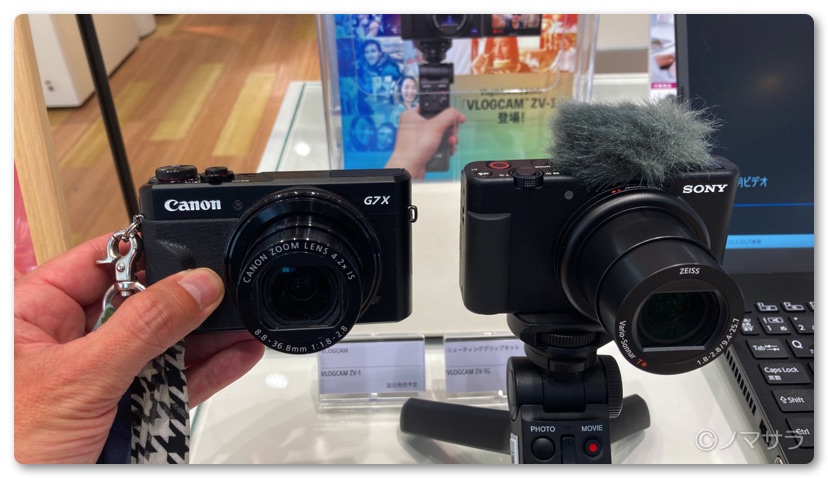 サイズを比較しましたが本体の横幅や奥行きなどはVLOGCAM ZV-1が約105.5×60.0x43.5 mm、G7 X MarkIIが105.5 × 60.9 × 42.2mmとほぼ同じ。レンズの出っ張りはG7 X MarkIIの方が短くコンパクト。本体重量はVLOGCAM ZV-1が約294g、G7 X MarkIIが約319gと25gほどZV-1の方が軽量となっています。