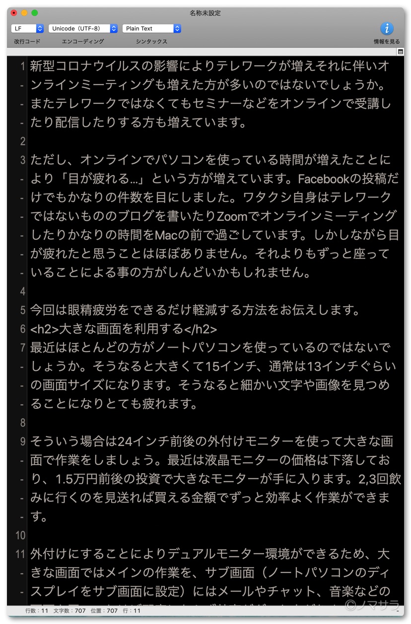 最近はOSやアプリの設定でダークモードで使えるものが増えています。ダークモードとは画面のバックが白ではなく黒で使うモードになります。黒にすることにより画面の発光が抑えられるため目に入る光が減り、伴って目の疲れが軽減されます。黒字に白の文字は慣れると快適でほぼこの状態で記事を書いています。もし、文章などを書くのに時間をかけている方はダークモードで使ってみてください。