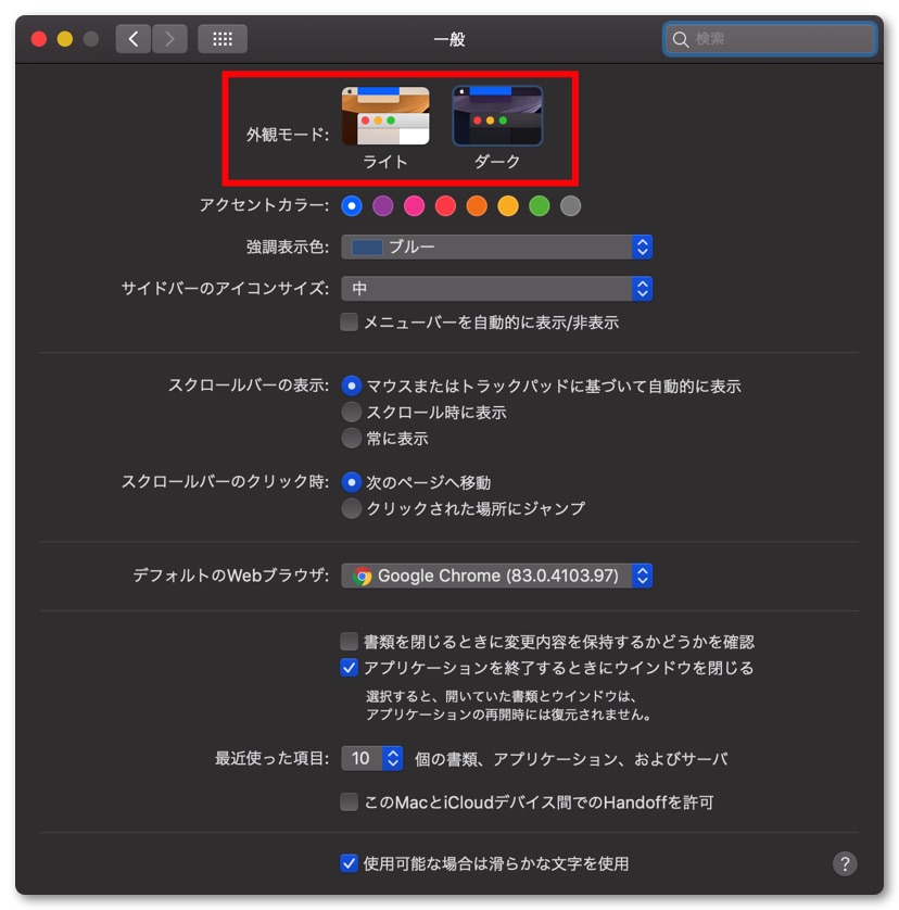 MacOSのOS側でダークモードに切り替えると、自動的にChromeはダークモードになります。ダークモードに対応しているMacOSは、バージョン10.14(Mojave)以降。MacOSをダークモードにするには、まずメニューバー端のリンゴアイコンをクリックし、表示されたメニューで[システム環境設定]を選びます。「システム環境設定」が表示されたら、[一般]アイコンをクリックします。「一般」ダイアログにある「外観モード」で[ダーク]を選びます。