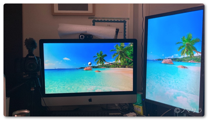 外付けにすることによりデュアルモニター環境ができるため、大きな画面ではメインの作業を、サブ画面(ノートパソコンのディスプレイをサブ画面に設定)にはメールやチャット、音楽などの画面を置いておけば邪魔にならず効率がグッと上がります。ワタクシの場合、書斎はiMacの27インチに22インチのディスプレイをサブモニターとして使っています。サブモニタは数年前に大須のショップインバースで中古で5,000円で購入しました。こだわらなければ中古でもいいと思いますが最近は新品の価格も下落しているので少々高くても最新のモニターを購入することをオススメします。