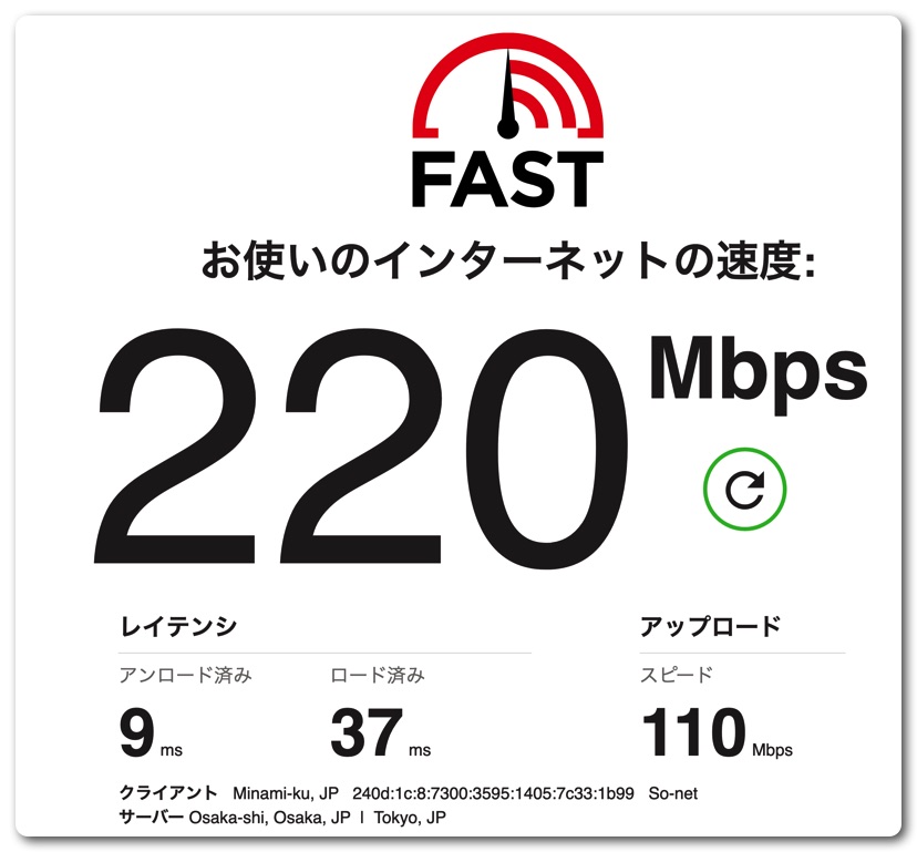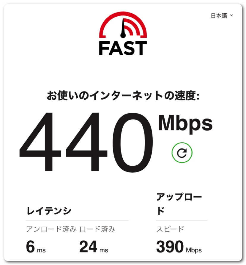測定は事前にFast.comで測定するよう指示があり統一されています。NETFLIXが提供している速度測定サイトで一番簡単で比較的正確なデータが得られます。ダウンロード(下り回線)の速度のほか、詳細ボタンを押せばアップロード(上り回線)の速度やレイテンシ(遅延)の測定もできます。