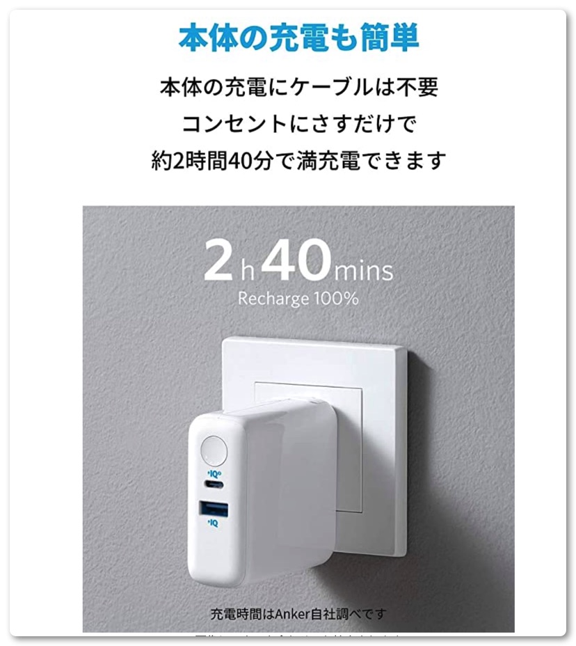 USB急速充電器として使用しながら本体を充電でき、そのままモバイルバッテリーとして持ち歩くことができます。折りたたみ式プラグで収納も簡単です。充電器としての使用時は、まずお使いの機器を充電し、その後本体の充電を開始します。