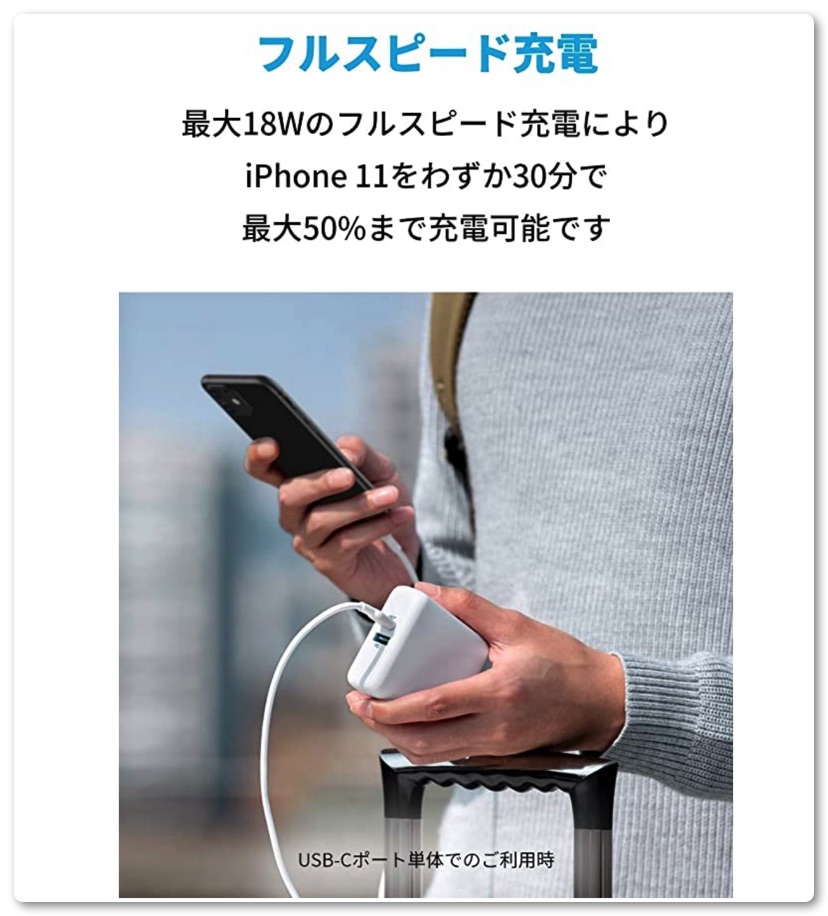 PD対応となりフルスピードで充電できるようになりました。iPhone11をわずか30分で50%まで充電することが可能。また低電流モードも搭載されているためイヤホン等の小型電子機器やウェアラブル機器に最適な電流で充電することができます。