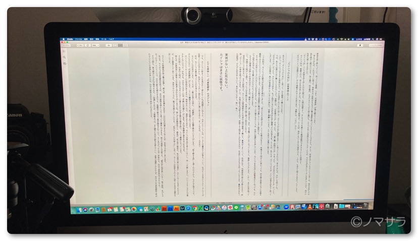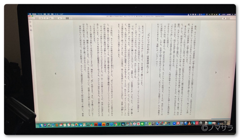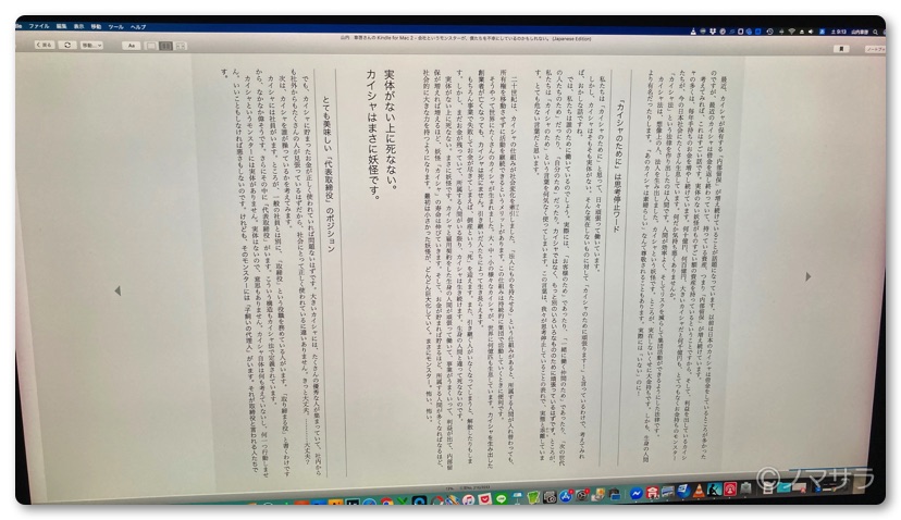 そんな折に勝間和代さんのメルマガでパソコンにKindleのアプリを入れて読んでいるという情報が流れてきました。早速、iMacにKindleのアプリを入れてみたところ、これが超快適。27インチのiMacを使っていますがこのサイズだと雑誌見開きでほぼ等倍か少し大きい程度のサイズになります。