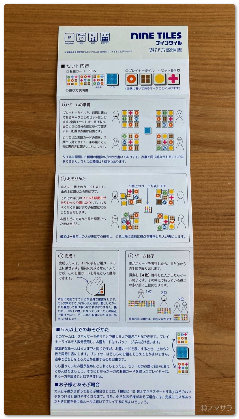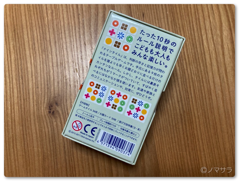 Rちゃんの家を訪れる度に勉強になるような本を借りてきたり、カードゲームで遊んで来たりして今まで知らなかった情報を得て帰ってきます。持つべきは賢い友人だなぁといつも感謝しています。今回紹介する「ナインタイル」は先日遊びに行ったときに一緒に遊んで来たらしく「めちゃくちゃ面白かったヨ!おとうさん買って〜」とせがまれました。3日ほど時間を空けて再度聞いてみたら「絶対欲しい!」というので購入することにしました。Amazonのレビューでも高評価だったのでそれも後押しになりました。