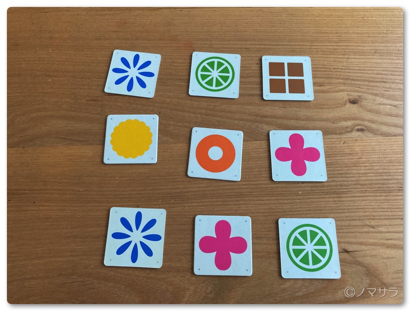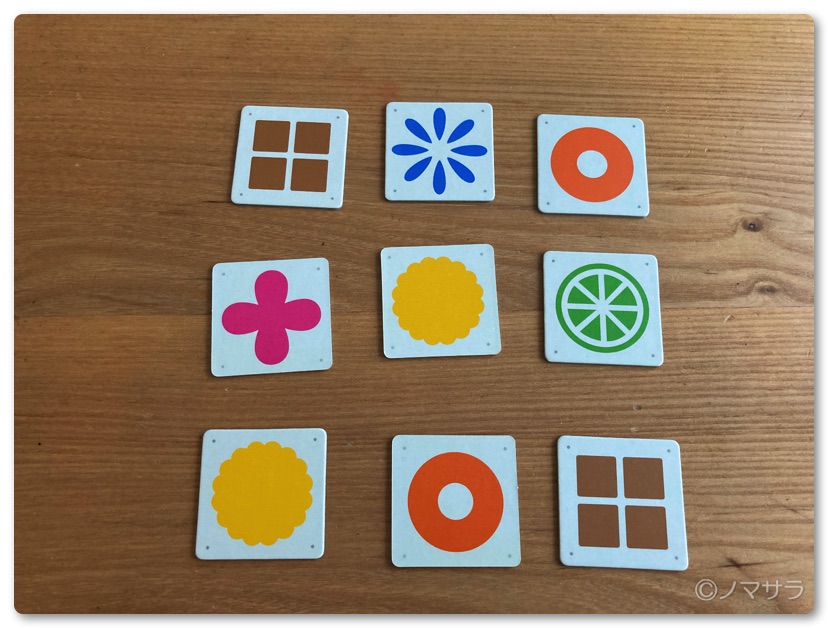 「ナインタイル」は9枚のタイルの裏表にキウイ、クッキー、ドーナツなど6種類の図柄が描かれており、それをお題のカードの通りに並べるゲーム。1セットで4名まで遊ぶことができます。
