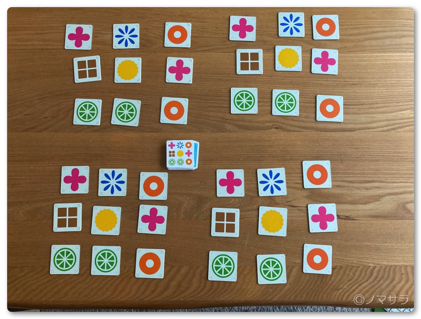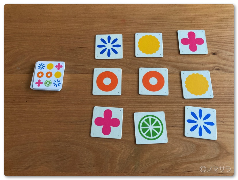 ルールはとても単純なので10秒あれば理解できますが、いざお題の通りに並べようと思うとかなり頭脳を使います。ただ単純にカードを並べていると図柄が足りなくなり、上手に組み合わせる必要があります。文章で書くと難しのですが実際に手で動かすとルールはとても簡単。ただし、揃えるのはそう簡単ではありません。