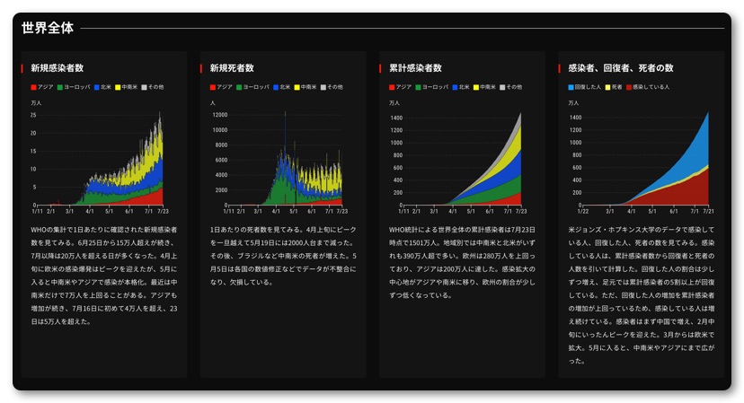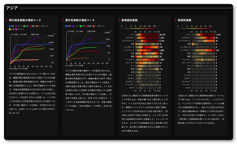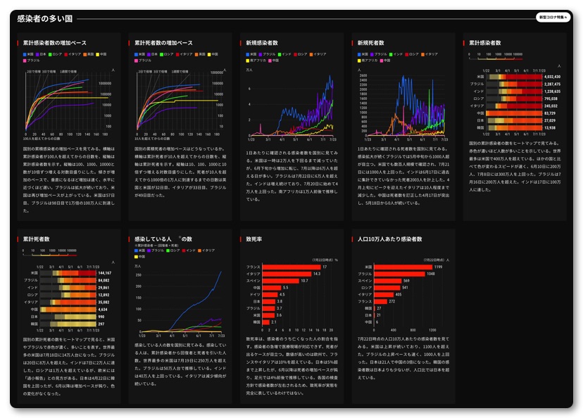 最後に日本経済新聞のWEBサイト「チャートで見る世界の感染状況」のリンクを貼っておきます。世界各国とも死亡者数は横ばいになり終息していることがわかります。これを見てもまだ日本の感染者数ヤバい!コロナ怖い!マスクつけろ!と言ってたらデータを見る読解力がないので小学校の教科書を購入してグラフの勉強をしましょう(笑)