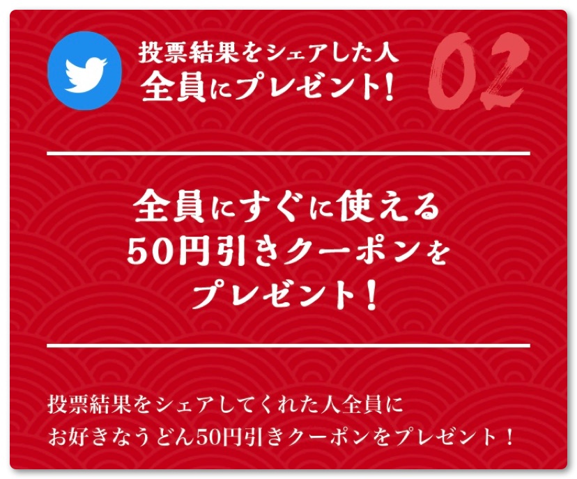 また投票結果をシェアした人全員にすぐに使える50円引きクーポンがプレゼントされますので丸亀製麺で食事をする方はぜひチャレンジしてみてください。
