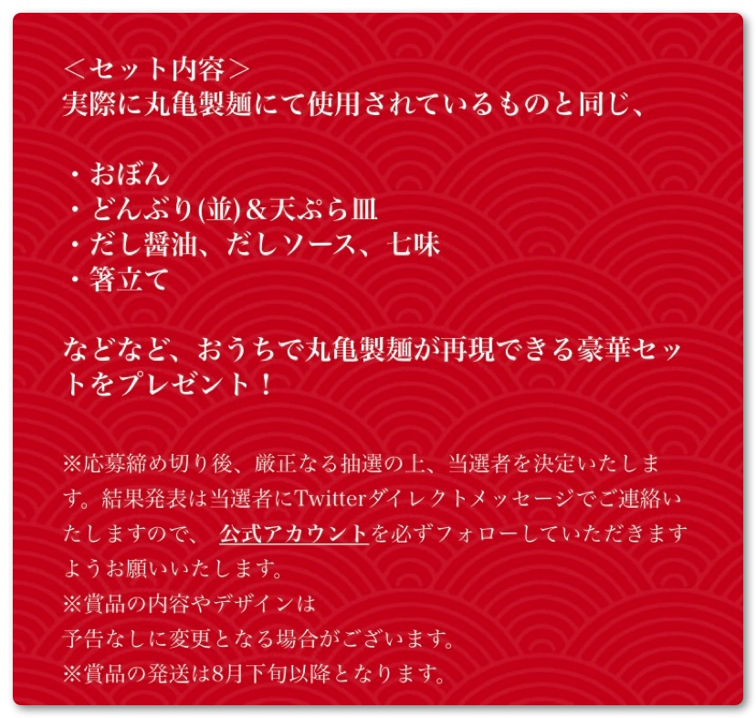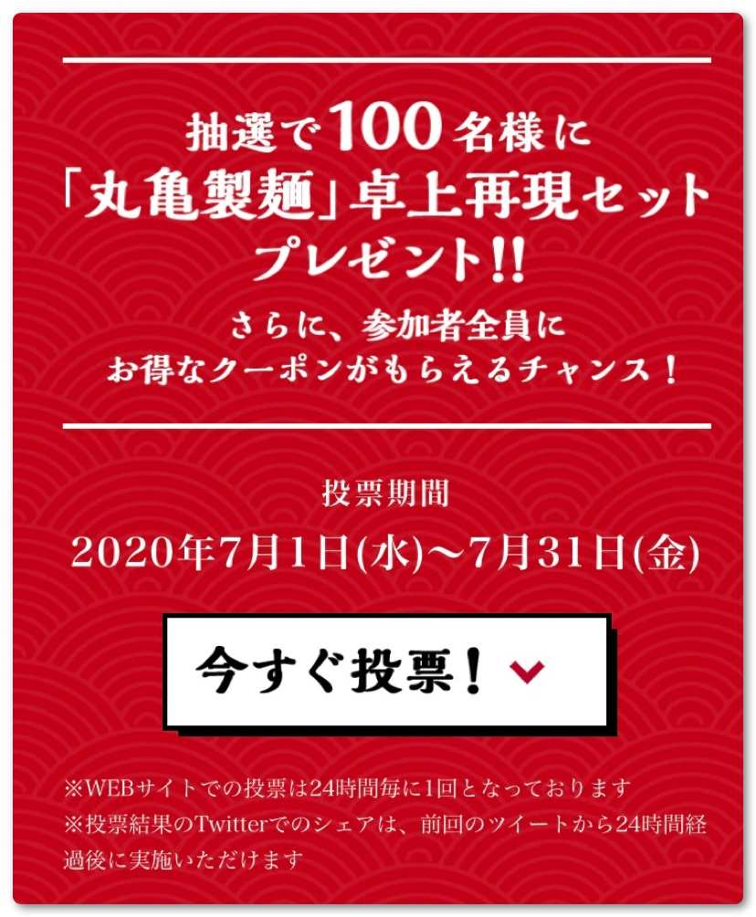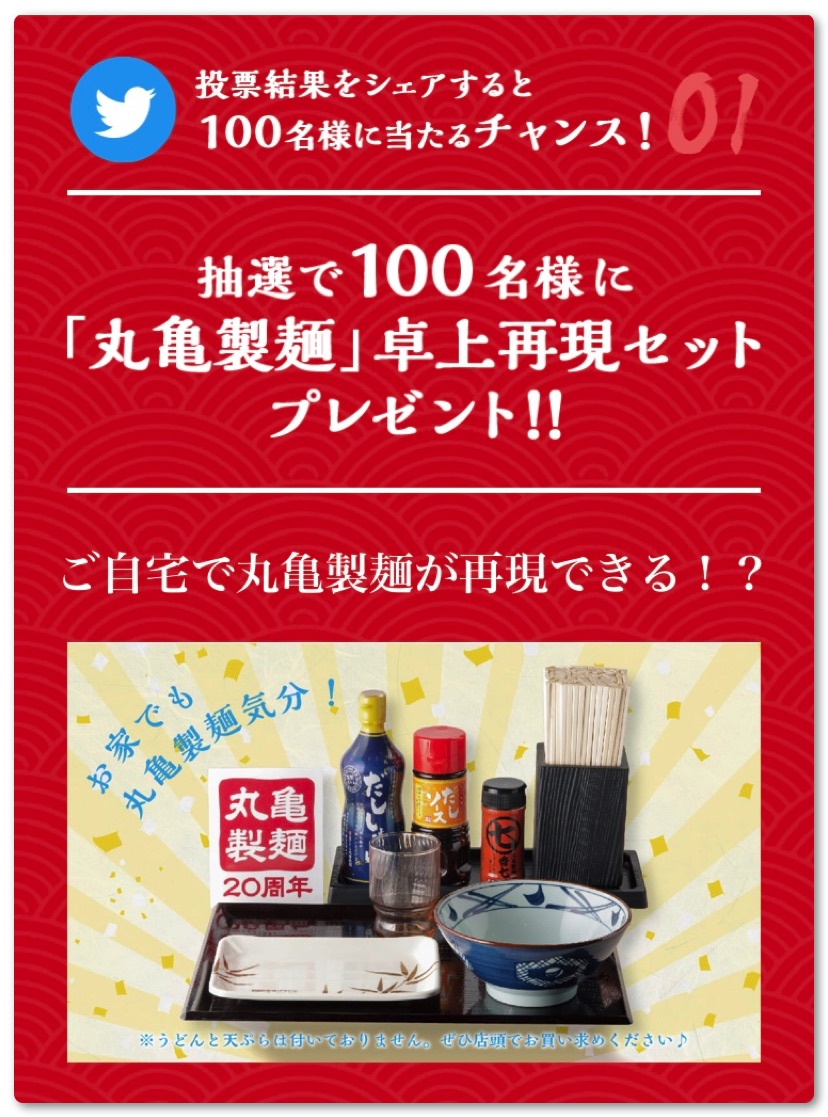 投票結果をツイッターでシェアすると抽選で100名様に「丸亀製麺」卓上再現セットがプレゼントされます。自宅で丸亀製麺が再現できる愛好家にはたまならいグッズとなっています。