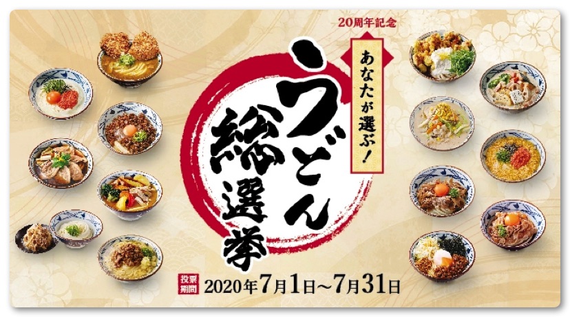 その丸亀製麺が創立20周年ということでアプリ上で「うどん総選挙」と銘打って人気投票を行っています。期間は7月1日〜31日までなので残り僅かとなりました。過去話題を呼んだ14品のうどんの中から一位を選抜するうどん総選挙で1位になったメニューは2020年秋冬に期間限定で販売されます。