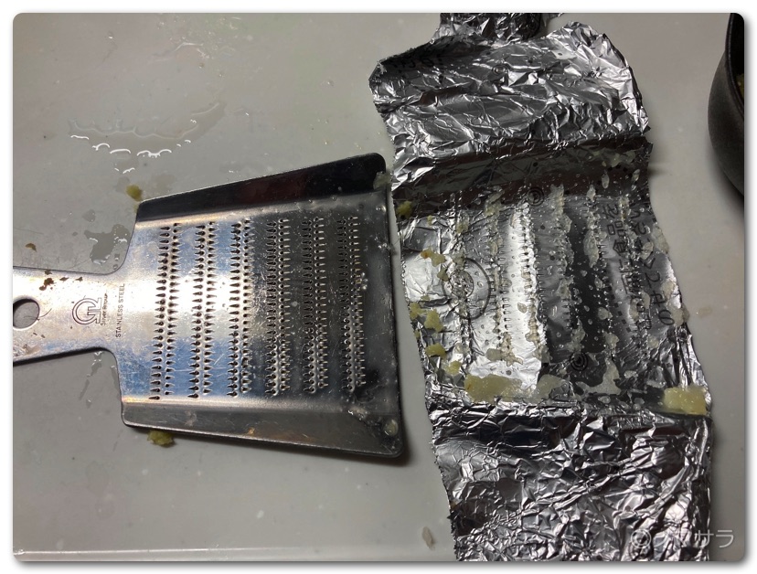 はたしてアルミホイルを被せて擦れるのか疑問を持ちつつ試してみたら、これが画期的!おろし金の性能はそのままに擦り終わったニンニクや生姜は全て綺麗に取れます。一切、おろし金には移っておらずほぼ100%使い切ることができます。