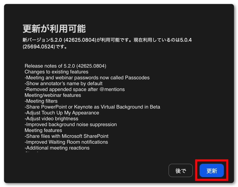 まずはZoomを最新版の5.2.0にアップデートします。これをしないと今回紹介した機能は使えませんので必ずアップデートしてください。なお、現時点ではPC版のみの機能となりますのでスマホやタブレット版では使えません。