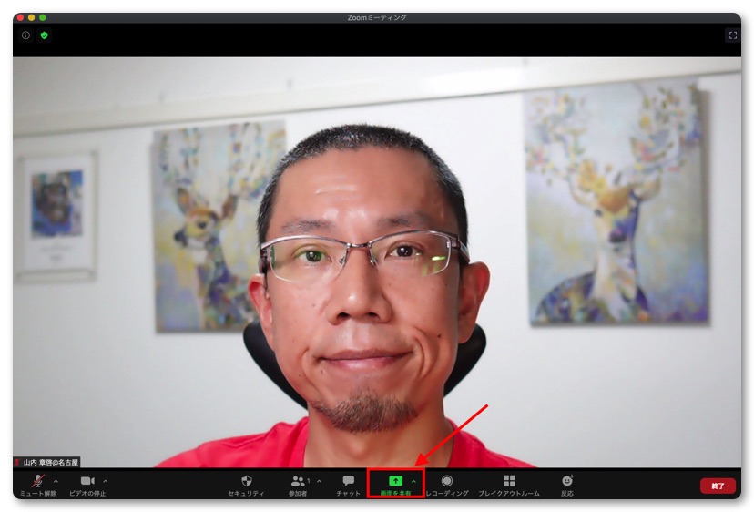 これでバーチャル背景としてプレゼン資料を映すことができます。なお、相手が最新バージョンの5.2.0にアップデートしていないと映り込み機能は反映されず通常のプレゼン資料しか見えませんので、この機能を使いたい場合は相手にもアップデートを促しておきましょう。
