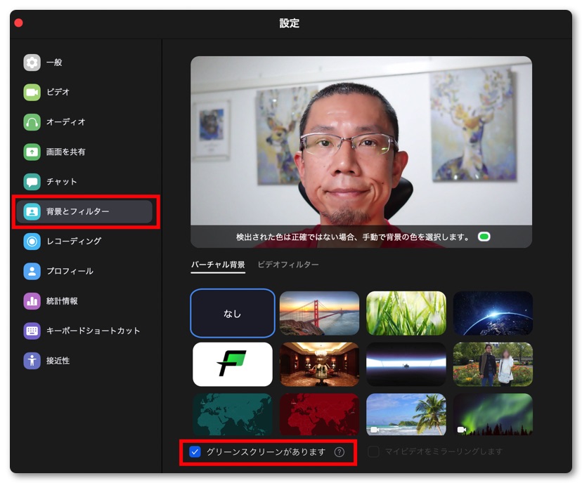 バーチャル背景を使わずそのまま部屋の風景を映したい場合は設定項目の背景とフィルターの中の下段にあるグリーンスクリーンがありますにチェックを入れるとそのまま映すことができます。ただし緑色の部分があるとそこが透過されてしまうのでその点にはご注意ください。