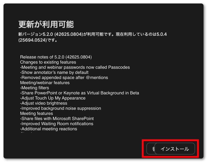 まずはZoomを最新版の5.2.0にアップデートします。これをしないと今回紹介した機能は使えませんので必ずアップデートしてください。なお、現時点ではPC版のみの機能となりますのでスマホやタブレット版では使えません。