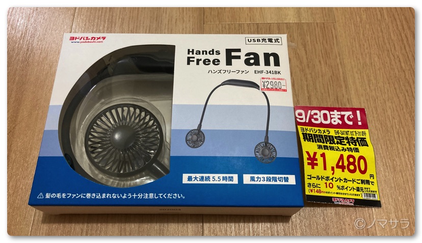近々ゴルフのラウンドがあり天気予報を見ると最高気温が35℃になっていたため対策用に首掛けハンズフリーファンの購入を検討しました。Amazonである程度下調べした後、他の用事がありヨドバシカメラへ立ち寄ったらヨドバシカメラオリジナルの首掛けファンが2,980円から1,480円へと半額へ値下げされていました。