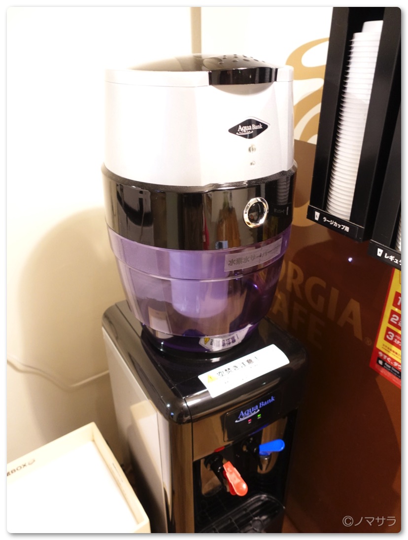 水は水道水を浄水処理して水素水に変えるウォーターサーバーが設置されており無料で飲めます。