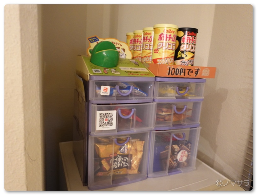 また100円で購入できるお菓子が置いてあります。PayPayでの支払いも可能。