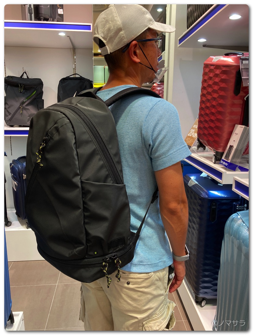 普段エスカレーターは使わないのですが5時間ラウンドしてクタクタだったのでエスカレーターで降りたら旅行用品コーナーのサムソナイトの売場に見たことのないリュックが置いてあるのが目に入りました。