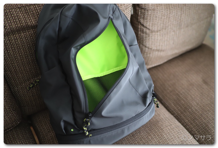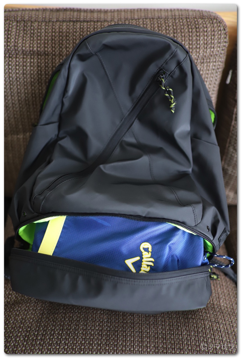 リュック下部のポケットは結構容量があり靴などを入れることができます。ゴルフやジムに行くときにもいいかも。