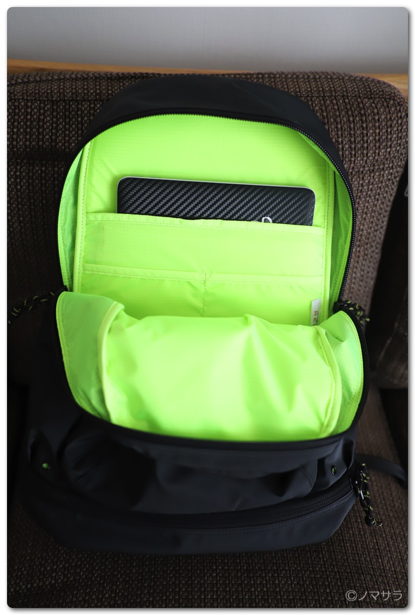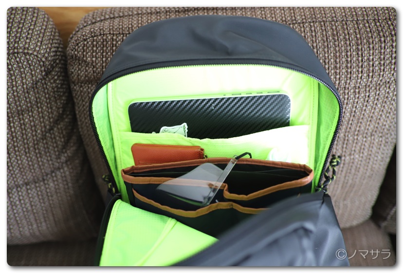 メインポケットには縦長のバッグインバッグを入れて仕切りを作っています。