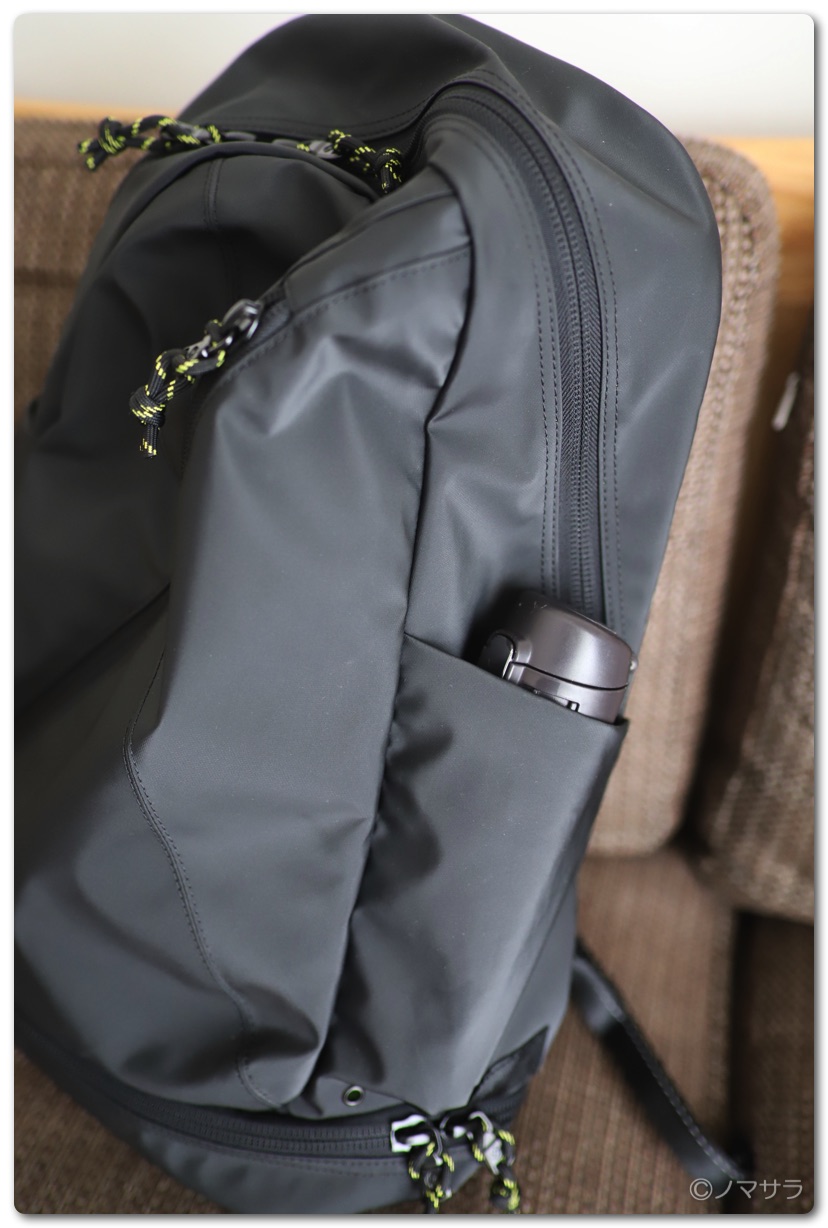サイドポケットにはマグボトルや折りたたみ傘が入ります。