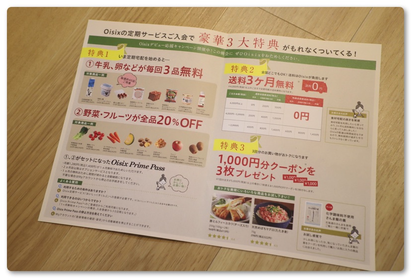 今ならOisixデビュー応援キャンペーンということで定期サービスに入会すると豪華3大特典がもれなくついてきます。