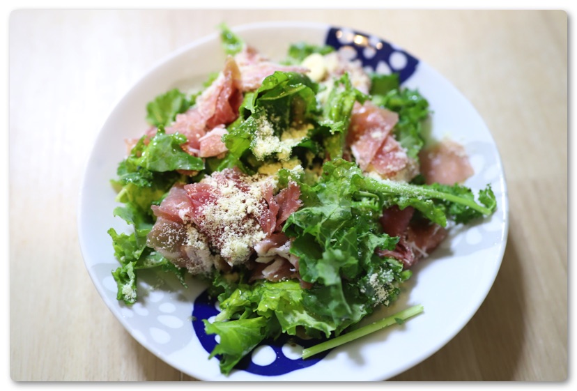 ケールをサラダにして食べましたが苦味はありません。他で購入した生ハムを加えてオリーブオイルと岩塩、パルメザンチーズを削ったものをふりかけて食べましたがパリパリ・シャキシャキの食感でメチャウマ。